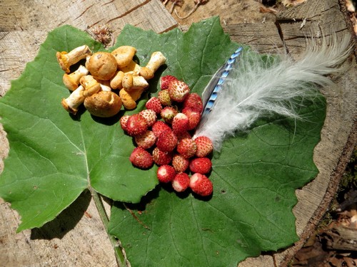 Foto: Schätze aus dem Schönbuch: Einige Pfifferlinge von der Nachlese, frische leckere Walderdbeeren, eine Eichelhäherfeder, eine Flaumfeder vom weiß der Kuckuck und das alles präsentiert auf Blättern vom Huflattich oder der Gewöhnlichen Pestwurz bildete den Fund von Renate.