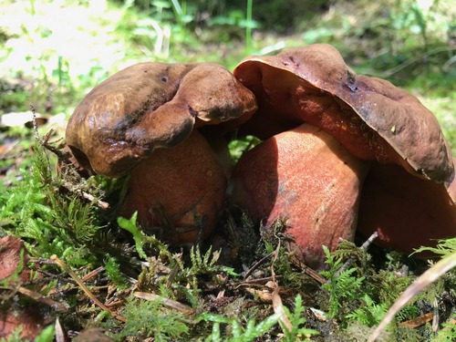 Foto: Ein schöner Fund für Ronny und Heiko mit der Übermacht von prächtigen, farbenfrohen Flockenstieligen Hexenröhrlingen. Rechts oben zwei Falsche Anhängselröhrlinge, die ihnen bei über 24 gefundenen Exemplaren gerne gegönnt seien.