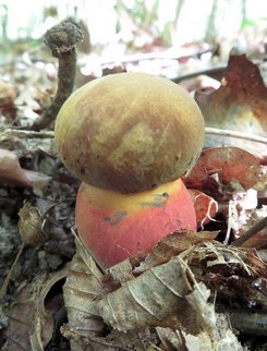 2 Fotos: Die Farben des Röhrlings links im Bild verunsichern, weil sie das typische Karminrot des Schönfußröhrlings zeigen, dessen Stielspitze ins Gelbe übergeht. In solch einem Fall geben die Röhren Aufschluss, die beim Flockenstieligen Hexenröhrling rotorange sein müssen. Beim Schönfußröhrling wären sie gelb. Rechts ein schöner junger Speisetäubling.
