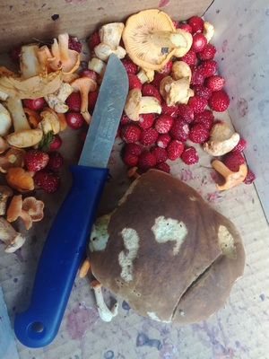 Dazu fanden wir Maggikraut und Walderdbeeren. Wir sind zufrieden, es wird für je eine kleine Pilzpfanne reichen. Und meine Tochter bekommt die Walderdbeeren.
