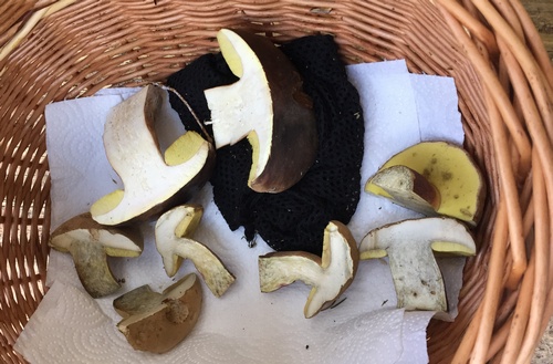 Nach etwas über drei Stunden fand dann doch noch ein Steinpilz, es war der erste in diesem Jahr, den Weg in mein Körbchen. Einige wenige Ziegenlippen kamen noch hinzu.