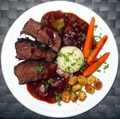 Am Abend gab es dann ein zugegebenermaßen nicht so sommerliches Gericht: geschmorte Ochsenbäckchen in einer Rotweinreduktion. Das Lob geht dieses Mal an meinen Vater, der das tolle Essen am Sonntag für die ganze Familie zubereitete. Ich habe heute lediglich meinen Rest mit den gesammelten Pilzen, selbst gemachten Kartoffelklößen und glasiertem Möhren- und Esskastaniengemüse zubereitet (1. Foto rechts).