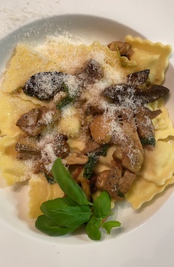 Oliver schreibt am 17. Juli 2020 zu diesen 4 Fotos: »Lieber Heinz-Wilhelm, die Trockenheit hat hier einiges weggebrannt. Jetzt hat es mal zweieinhalb Tage geregnet und immerhin geht es mit Täublingen und Pfifferlingen los. Aber auch einen Kornblumenröhrling (Foto oben links) habe ich gefunden, wie auch wieder ein paar Hexeneier (rechts daneben). Mit den mitgenommenen Pilzen habe ich ein bisschen kulinarisch experimentiert, einen Teil gab es zu Pasta (unten rechts).