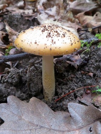Foto: Fransige Wulstlinge, zu erkennen am von Hüllfetzen schütter bedeckten Hut und am fransigen Behang der Hutränder, sind ausgezeichnete Speisepilze. Zwei Tage später dürfte dieser Pilz einen wie zerfetzten Gesamteindruck machen. Man sollte diese Pilzart nur ernten, wenn man sie »todsicher« vom Pantherpilz unterscheiden kann. Wie der Scheidenstreifling, so ist auch dieses ein formschönes Exemplar, fotografiert zum rechten Zeitpunkt, um die Charakteristika des Pilzes hervorzuheben. Fransige Wulstlinge zeigen Kalkböden an und stehen gerne an wärmebegünstigten Stellen bei Hainbuchen.