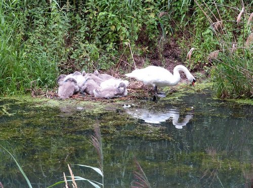 Foto: Da gestern bereits die Geier im Anflug waren, sollen heute die Schwäne nicht zu kurz kommen. Michaels Foto zeigt eine Schwanenmutter mit ihrem noch flauschigen Nachwuchs.