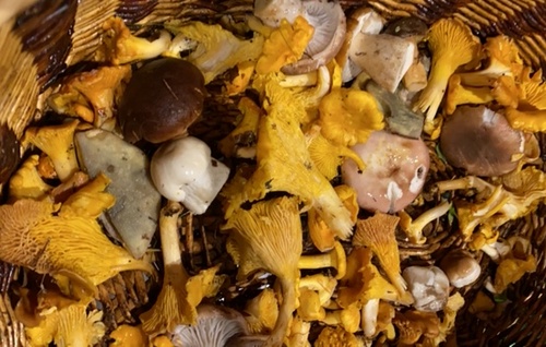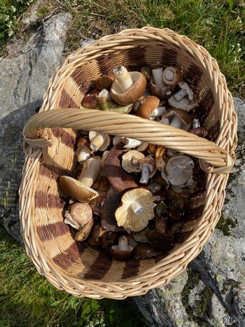 Foto: Lange musste Oliver in diesem Jahr warten, bis sein Pilzkorb wieder einen so schönen Anblick bot. Wir erkennen Pfifferlinge, Steinpilze, Kuhmaul und mindestens einen Fleischroten Speisetäubling. Das weckte bei ihm die Lust und Hoffnung auf mehr in den kommenden Tagen!