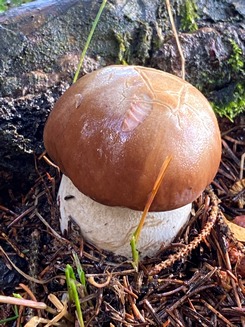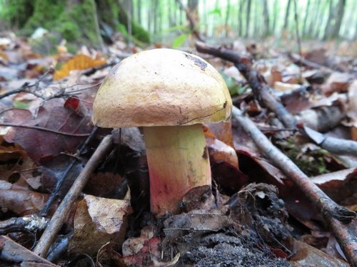 Foto: Achtung, die Kombination dieser Stielfarben ist mit Vorsicht zu genießen. Sie sind das typische Markenzeichen des Schönfußröhrlings. Die Farbe der Röhren gibt Aufschluss. Und da Michael durchaus zwischen Orangerot (Hexenröhrling) und Gelb (Schönfuß) unterscheiden kann, dürfte er diesen schönen Pilz dann doch als Flocki in den Korb gelegt haben.