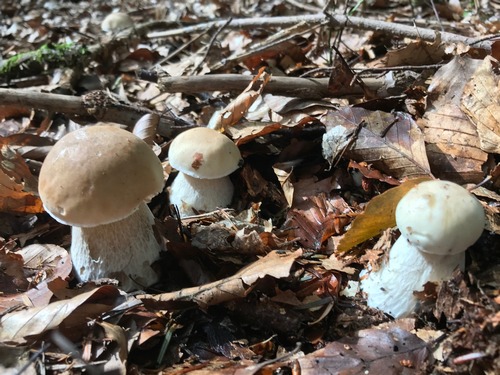 Foto: Einfach phantastisch, wie diese drei jungen Steinpilze im Buchenlaub stehen. Muss das eine Freude nicht nur für Merle bei Sammeln gewesen sein!