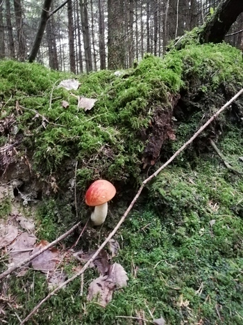 Die ersten - wenigen - Steinpilze hatte ich schnell gefunden. Sie wuchsen auf einem alten, teils grasbewachsenem Rückeweg in einem Fichtenwald. Abseits dieser Wege fand ich keine Pilze, trotz langer Runden.