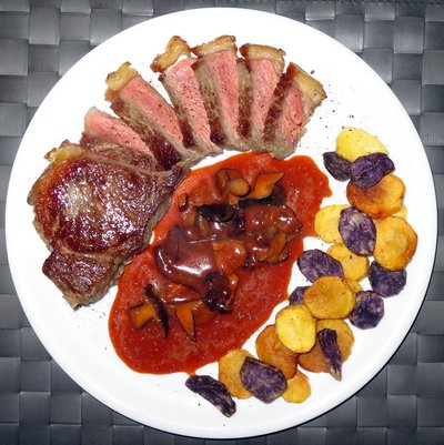 Zubereitet habe ich ein schönes Stück Roastbeef vom Emsrind (28 Tage gereift), gebackene bunte Gartenkatoffeln und eine Jus aus Zwetschgenwein mit den Büscheligen Raslingen.
