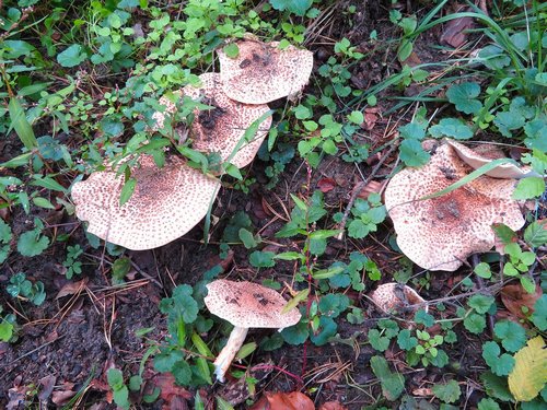 Foto: Und sie bleiben bitte alle unangerührt. Spitzschuppige Schirmlinge, auf dieser Website erstmals vorgestellt, sind sehr giftig. Am besten sind diese Pilze, die eine imposante Größe von bis zu 18cm Durchmesser erreichen können, an ihrem widerlich stechenden gasartigen Geruch zu erkennen. Im jungen Stadium haben sie braune Stacheln auf hellem Grund, die aber später abflachen. Spitzschuppige Schirmlinge sind sehr stark magen-darm-giftig, im Zusammenwirken mit Alkohol sollen sie sogar lebensbedrohlich sein.