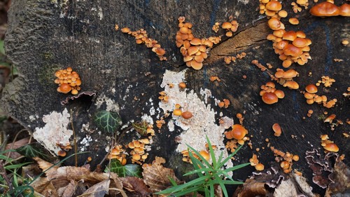 Als die Kleine spielte, schaute ich mich ein bisschen in den Grünstreifen um. Und so entdeckte ich im Efeu an einem Stumpf einer Weide leuchtend gelbe Samtfußrüblinge. Bislang hielt sich diese Stelle noch etwas zurück in diesem Winter, aber nun sind sie auch hier vertreten. Und das auch gleich mit richtig schönen und kräftigen Exemplaren.