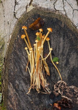 Foto: Junge Samtfußrüblinge an einer Stammschnittfläche. Sie dürfen noch weiterwachsen. Auf dem 2. Foto haben sie mit ihren langen Stielstrippen beinahe das Aussehen der Enoki-Zuchtform. (4 Fotos © Eva)