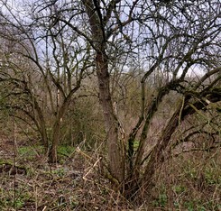 Direkt am Wegrand sah ich einen Holunderbaum, an dem noch ein paar Nachzügler von Winterpilzen wuchsen. Im oberen Bereich waren es Austernseitlinge, unten spickten Samtfußrüblinge aus der Borke (Foto rechts), die aber allesamt an Ort und Stelle bleiben durften.