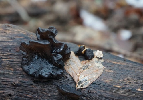 Foto: Hauptdarsteller in der Mitte ist ein Rotbrauner Zitterling, der sogar wie der Goldgelbe essbar wäre. Allerdings schmeckt er nach nichts und die Konsistenz ist auch nicht jedermanns Sache. Links davon im Hintergrund an der Hainbuche verstecken sich zwei ältere Wintertrompetenschnitzlinge (kaum erkennbar) und auf dem Stamm wachsen Rotbraune Kohlenbeeren, die aufgrund der Witterung fast schon schwarz erscheinen und somit kaum als Fruchtkörper eines Pilzes auffallen. Die beiden Letztgenannten sind ungenießbar.