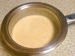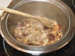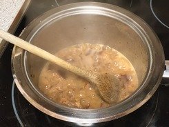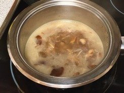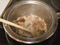 Mit 100ml Weißwein ablöschen, verkochen lassen und dabei die Aromen vom Boden lösen. Anschließend nochmals 100ml Weißwein und 400ml Fleischbrühe angießen und etwa 10 Minuten leicht köcheln lassen (4. und 5. Foto).