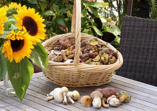 Foto: Ein schönes Pilzstillleben mit herrlichen Sonnenblumen! Alles ist sorgsam geputzt. So viele Rotfüßchen sieht man selten in einem Pilzkorb; nicht wenige Pilzsammler gehen mehr oder weniger achtlos an ihnen vorbei. Wie schade! Sind sie doch von ausgezeichnetem Geschmack. (Foto © Wiltrud)