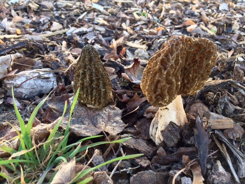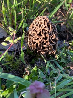 Foto 5: Auch im eigenen Garten zeigte sich Nachwuchs, in Farbe und Form auffallend unterschiedlich. Was hier der rundlichen Form wegen nicht wie eine Spitzmorchel aussieht, ist trotzdem eine. Denn Spitzmorcheln weisen charakteristische Längsrippen auf, im Gegensatz zu Speisemorcheln, die unregelmäßige bienenwabenartige Kammern haben.