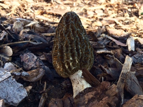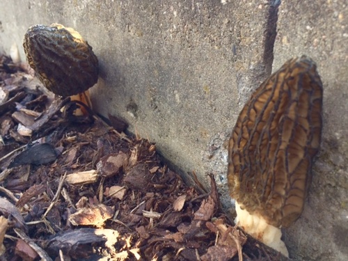 Übrigens, das 5. Foto mit den zwei kleinen Morcheln aus unserem Garten soll zeigen, dass in unserem Mulchbeet augenscheinlich und auch nach Untersuchung der Sporen zwei verschiedene Arten der Spitzmorchel (Morchella elata) wachsen. Da haben wir wohl mal so richtig Glück mit dem Mulch gehabt.