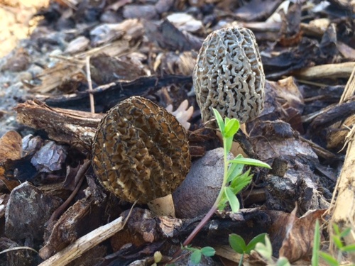 Foto 6: Meister der Tarnung sind sie! Die zwei sonnenbeschienenen Spitzmorcheln sind viel heller als die im Schatten wachsenden und passen sich perfekt der Farbe des Mulches an. Für Anfänger ist die Suche nach diesen erlesenen Pilzen wegen ihrer Nachahmungsfähigkeit (Mimikry) deshalb keine leichte Aufgabe.