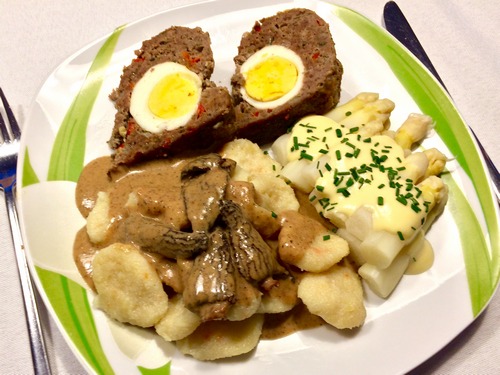 Ganz klassisch bereiteten wir einen Falschen Hasen mit dem Besten vom Spargel und einer - natürlich selbst gemachten - Sauce Hollandaise zu. Als Beilage gab es Pastinakengnocchi mit frischen Spitzmorcheln in einer feinen Morchel-Madeira-Rahmsoße.