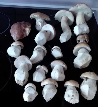 heute erkundete ich um Kronau wieder neue Waldstücke. Leider fehlt hier momentan wieder einmal der Regen, was den Röhrlingen etwas zu schaffen macht. Nichtsdestotrotz hatte ich eine schöne kleine Ernte, bestehend aus zwei Steinpilzen, Hainbuchenrauhfüßen, Schwarzblauenden Röhrlingen, zwei Speisetäublingen, einem Grüngefelderten Täubling, Edel- und Fichtenreizkern, Violetten Lacktrichterlingen und Samtigen Pfifferlingen (Orangenleistlingen).