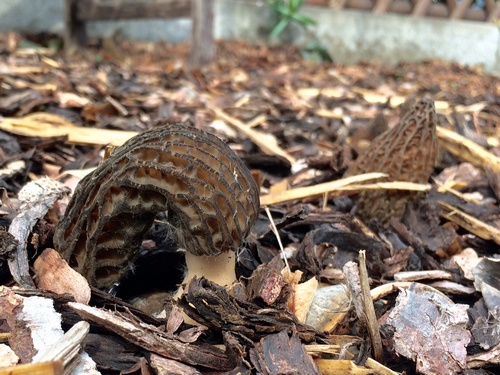 Foto: Köstliches aus Nachbarins Garten. Diese RiMuMo (Rindenmulchmorcheln) durfte sich Michael nach einem Hupfer über die Mauer holen. Eine ganz helle war auch dabei (2. Foto, rechts).