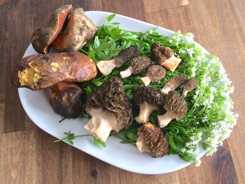 Foto: Auch Thomas hatte beizeiten geahnt, dass die Flockenstieligen Hexenröhrlinge zum abgelaufenen Wochenende aufmarschieren dürften. Und schon liegen sie, zusammen mit Spitzmorcheln auf Waldmeister gebettet, auf dem Teller. (4 Fotos © Thomas)
