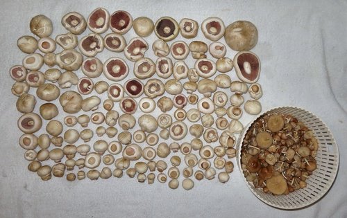 Foto: Parade der ersten - und nur der besten - Champignons, gewachsen zu Hunderten auf den Pferdekoppeln bei Kronau. Für mehr Nelkenschwindlinge (in der Siebschüssel) reichte Michael die Zeit nicht. (3 Fotos © Michael)