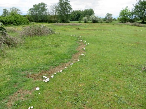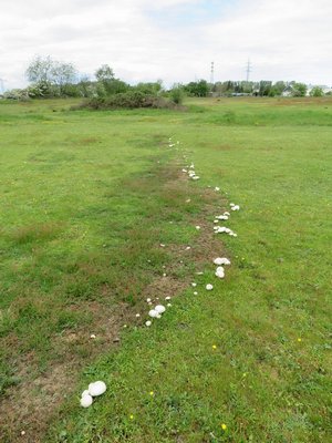 Foto: Eine von mehreren Champignonautobahnen, hier mit Linkskurve, die Michael auf den Pferdeweiden vorfand. Entlang des dunklen Streifens im Hintergrund der Wiese steht, nur schwer erkennbar, ein weiterer Champikonvoi.