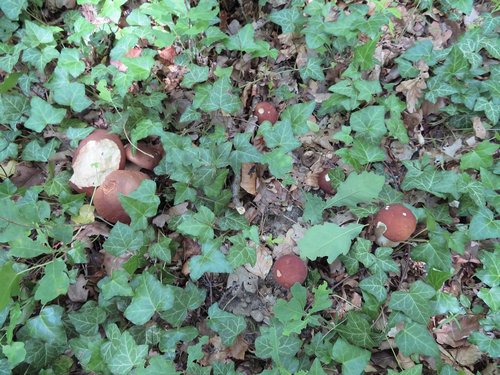 Foto: Sieben Sommersteinpilze auf einen Streich. Sie versuchen, sich vor Michael im Efeu zu verstecken.