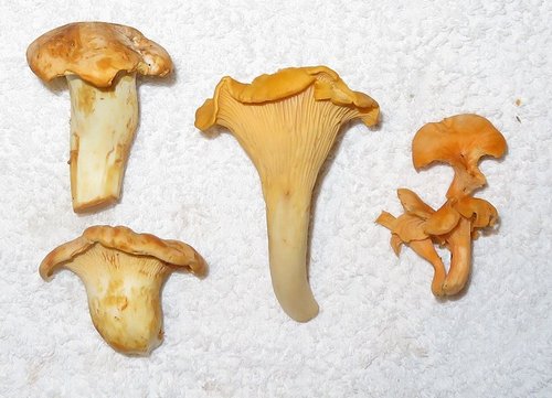 Foto: Ein sehr schöner Vergleich mit drei Pfifferlingsarten: wir sehen links Blasse Laubwaldpfifferlinge, in der Mitte einen (gewöhnlichen) Pfifferling und rechts Samtige Pfiferlinge.