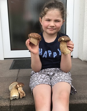 Foto rechts: Vier Sommersteinpilze hat Merle am Sonntag, 27. Juni 2021, mit ihrem Papa Heiko im Schwäbisch-Fränkischen Wald gefunden. (Foto © Heiko)