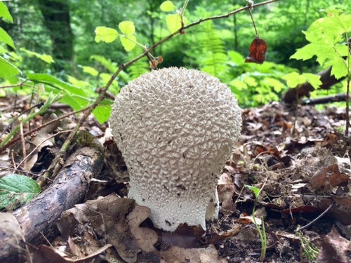 Foto: Dieses Bild mit einem Hasenstäubling überrascht etwas: ich habe diese wohlschmeckende Pilzart bislang ausschließlich auf Rasen beziehungsweise Weideland gefunden. Aber er scheint sich im lockeren Blätter-Boden-Gemisch ausgesprochen wohl zu fühlen, geht man nach seinem Aussehen.