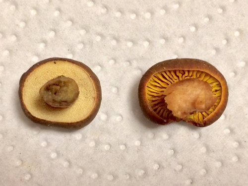 Foto: ...wenn man die PIlze umdreht. Obwohl das Goldblatt Lamellen hat, wird es wegen genetischer Übereinstimmungen eher den Pilzen mit Röhren zugeordnet. Dieser Pilz gehört der Gattung Blätterröhrlinge an.