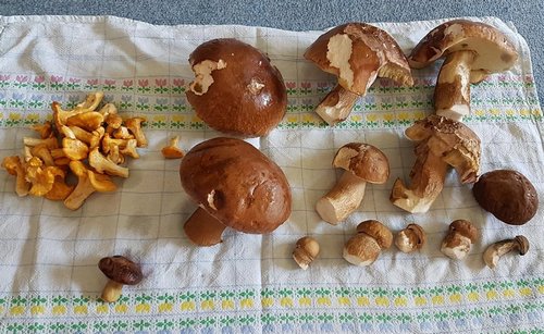 Wie man auf dem Foto sieht, waren vor allen die Pfifferlinge stark vertreten. Dazu gab es noch zwei junge Fichtensteinpilze, ein paar Flockenstielige Hexenröhrlinge, ein paar Braunkappen (Maronenröhrlinge), einen Frauentäubling sowie zwei Rotbraune Scheidenstreiflinge.
