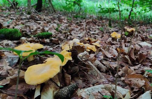 Foto: Die großen Pfifferlinge leuchteten durch den Wald, so dass Tobias im Schönbuch gleich sechs neue ihrer Wachstumsplätze entdecken konnte. (2 Fotos © Tobias)