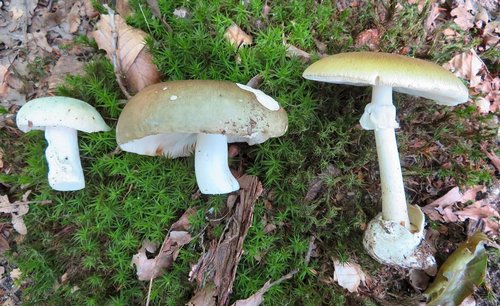 Vergleichsfoto 2: Und hier die gleichen Pilze in gleicher Anordnung in der Gesamtansicht. Die Stielbasis der zwei Täublinge ist hier leider nicht zu sehen; sie hat jedoch keinerlei Knolle und keinen Wurzelansatz. Ganz im Gegensatz zu dem Grünen Knollenblätterpilz (rechts). Seine zwiebelartige Knolle mit der wie eierschalenden Umhüllung ist ein unerlässliches Merkmal nicht nur für Pilzneulinge. Zur Bestimmung ist es deshalb sehr wichtig, den gesamten Pilz - samt Knolle - zu entnehmen.