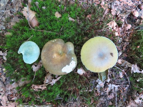Vergleichsfoto 1: Hier sehen wir einen Grüngefelderten Täubling (links), einen Frauentäubling (Mitte) und einen Grünen Knollenblätterpilz (rechts) von oben.