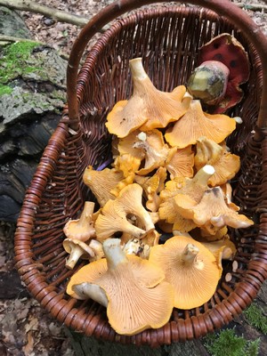 ein Ausflug heute Vormittag in die nahen Eichen- und Buchenwälder im Landkreis Böblingen brachte Merle, Eva und mir ein schönes Körbchen bester Laubwald-Pfifferlinge ein (Foto rechts).