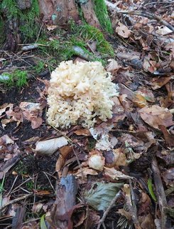 2 Fotos: Die Amethystschuppigen Pfifferlinge (links) standen wieder einmal zahlreich. Die Krause Glucke hingegen war die erste ihrer Art, die Michael in diesem Jahr gefunden hat.