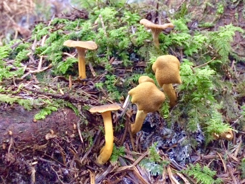 Foto: Auch hier mischen sich wieder junge Blutblättrige Hautköpfe unter die Trompetenpfifferlinge. Das muss man als fünfjähriges Kind erst einmal erkennen!