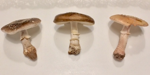 Foto: Grauer Wulstling, Pantherpilz und Perlpilz (von links). Die Farbe darf kein Unterscheidungskriterium sein: alle drei können in nahezu identischen Graubrauntönen auftreten!