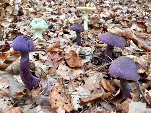 Foto: Thomas nahm einige Dunkelviolette Schleierlinge sogar mit, um Eisen zu tanken. Ich habe sie einmal gegessen. Eine relativ muffige Angelegenheit war's. Im Hintergrund lauern zwei Gelbe Knollenblätterpilze.