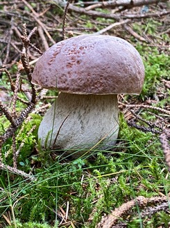 Foto: Einen Anblick, der Hoffnung macht, bieten diese zwei Fichtensteinpilze. Nicht nur, weil sie da so schön rumlümmeln, sondern weil sie auch von guter Qualität waren. Michael nimmt keinen madigen Pilzkörper mit nach Hause.