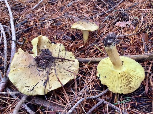 Dann zeigte sich ein guter alter Bekannter, der hier damals, wie auch heute noch, in einer größeren Anzahl wächst. Der giftige Kiefernwald-Grünling. Allerdings ist er mittlerweile auch streng geschützt und darf nicht entnommen werden. Da aber mehrere Fruchtkörper bereits von Wildschweinen herausgerissen waren, nahm ich einen davon und legte ihn neben zwei stehende Exemplare für das Foto.