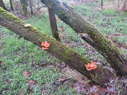 Hin und wieder kam mit einigen Austernseitlingen natürlich auch was essbares in den Korb. An einer Stelle wuchsen sie inmitten von Gezonten Ohrlappenpilzen und waren von Weitem kaum zu erkennen. Für schöne Farben in Rot und Orange, sorgten mitunter Samtige Schichtpilze und Orangeseitlinge.