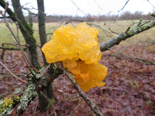 Foto: Nichts für die Küche, dafür etwas fürs Auge ist der Goldgelbe Zitterling, der an Rindenpilzen parasitiert, die an Laubbäumen wachsen. Der Pilz ist sogar essbar, jedoch völlig geschmacklos.