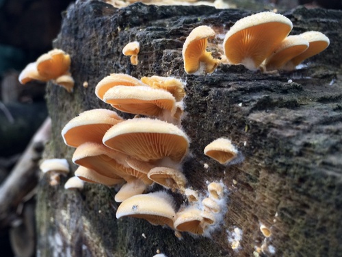 Gesammelt habe ich viele Austernpilze und Samtfußrüblinge. Alle Pilze waren gefroren und ließen sich ohne Messer mühelos abbrechen.