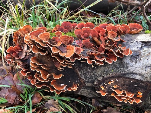 Fast alle liegenden Buchen sind derzeit übersät von Striegeligen Trameten und Gemeinen Spaltblättlingen. Ein weiterer schöner Blickfang waren Violette Knorpelschichtpilze, die zusammen mit Knotigen Schillerporlingen die Schnittfläche einer Buche besiedelten.